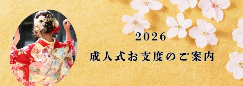 | お支度料金 | 振袖着付け 13,2000円(税込) ヘアセット、振袖着付け 20,000円(税込) 袴着付け 10,000円(税込) | ※当日お支払いくださいませ。 ※成人式特別価格 ※お釣り銭のないようにご準備お願いいたします。 ※PayPayでのお支払いも可能です。 ※小物レンタルについては個別に料金ご案内いたします。 |